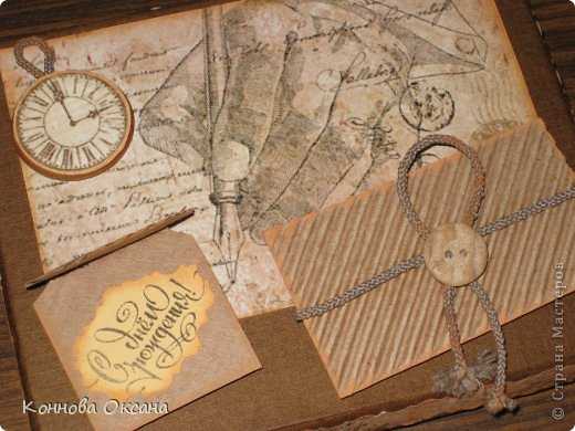 3.декор поближе… Часы — бумажная распечатка, приклеенная на деревянное колечко… «Конвертик» и «бандеролька» — из упаковки от зубной пасты… + завалявшийся шнурок, тонированный пастелью, и пуговица…