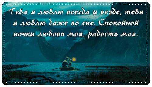 Любимая, мое сердце разрывается на части, когда я не могу разделить с тобой твой сон, когда между нами расстояние. Знай! Я всегда с тобой, ты — мои мысли, в моем сердце и в моей душе. Ни о чем не беспокойся, засыпай, пускай сон неторопливо накроет тебя и унесет в свой добрый и красочный мир. Пусть бледно-лиловое, хрустальное утро станет лучшим началом нового дня. Спокойно ночи, моя радость.