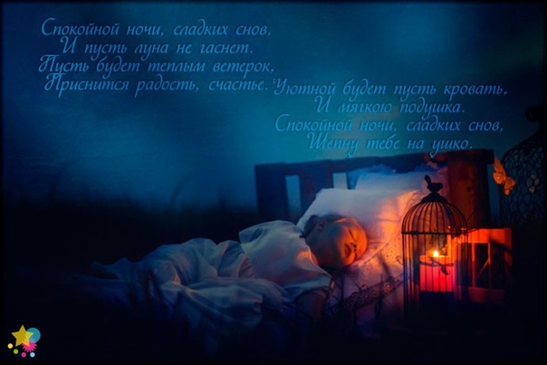Песенка моя, ласточка моя сизокрылая, мелодия моей души, цветочек мой аленький, любовь моя! Как же я рад, пожелать тебе размеренного, безмятежного сна! Пусть твои заботы улягутся на сей день, и ты сладко прикроешь веки! Пусть твои мысли растворятся в желаниях и планах на завтра! Желаю тебе воздушного полёта в сказочный мир снов, где ты вдоволь отдохнёшь душой и телом, где не достанут тебя заботы и повседневная суета!