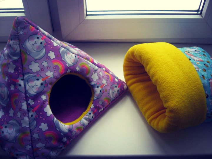 Сначала сшиваются тканевые части: внутренние с внешними, оставляя небольшое отверстие для того, чтобы вставить поролон. После того, как он вставлен, отверстия аккуратно зашиваются и домик готов.