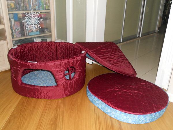 Довольно просто шьется домик для собаки типа «тапок». Это мягкая будка, в которой крыша есть только с одной стороны, а вторая – «пятка» открыта как лежанка. Такой домик становится универсальным, поскольку, когда собаке холодно, она может укрыться под крышей, когда жарко – переместиться на открытую часть домика.