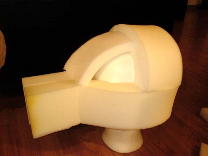 крыша тоже кроится из поролона, сначала овальной формы, а потом в ней с четырех сторон вырезаются клинья. Сшив эти разрезы, получаем выпуклую крышу.