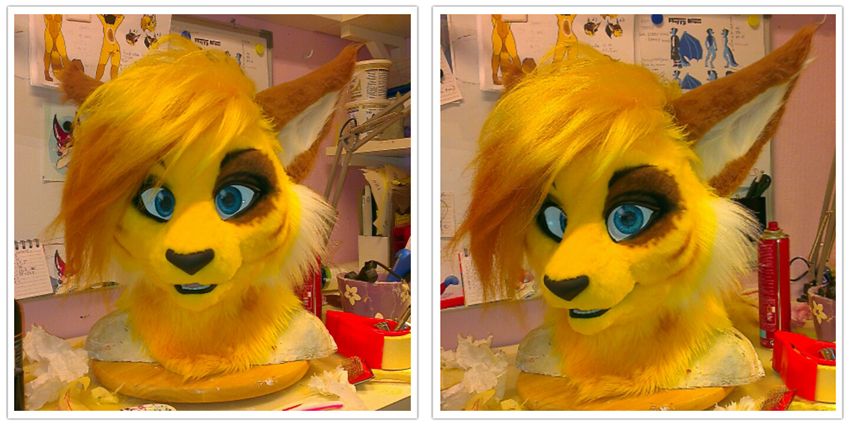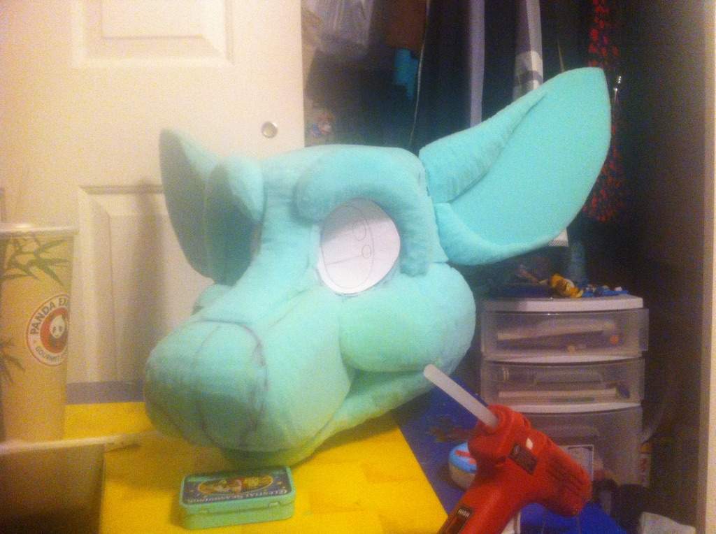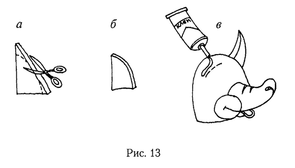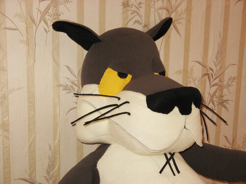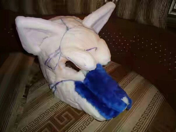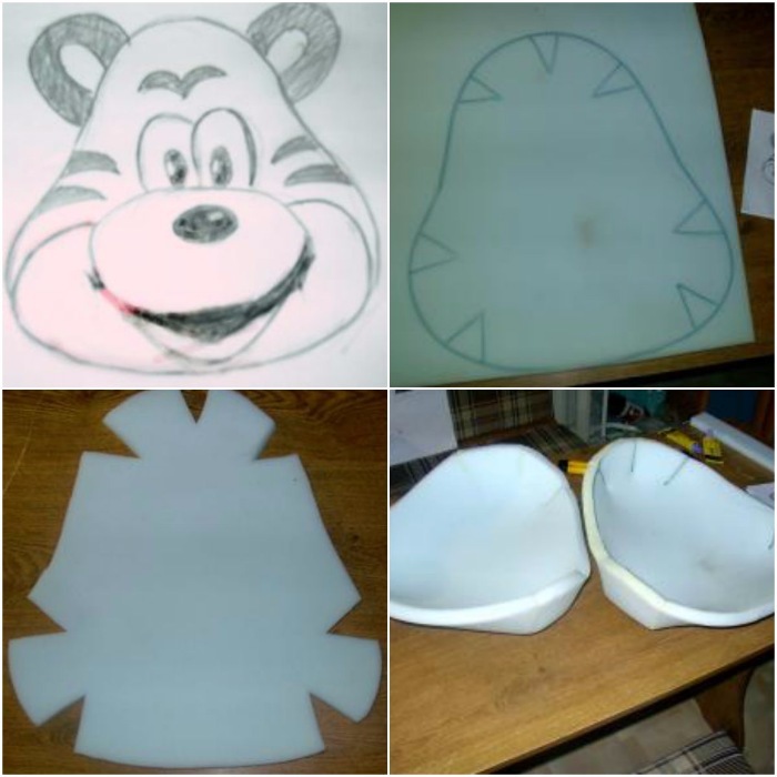 Сделать из него купол. Это часть будущей мордочки. Промазать клеем все торцы и приклеить к голове. Сформировать при помощи клея и сжатия пальцами нос и изгибы мордочки. Для нижней челюсти необходимо использовать поролоновый прямоугольник размером 12 см на 14 см.