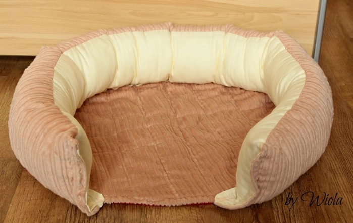 Измерьте параметры своего питомца и сделайте из поролонового материала подушку и боковую поверхность. Высота боковой поверхности может быть идентична выемке. Скрепите концы боковой поверхности с помощью толстых ниток и иглы.
