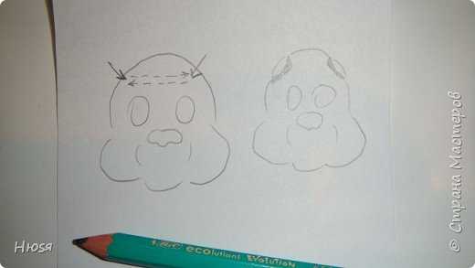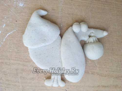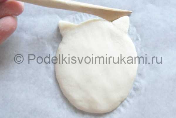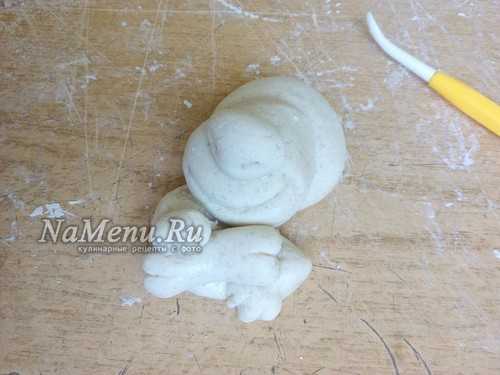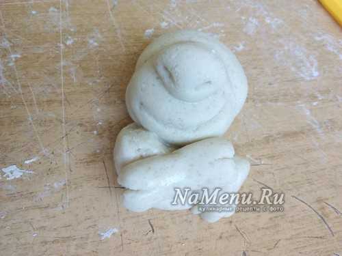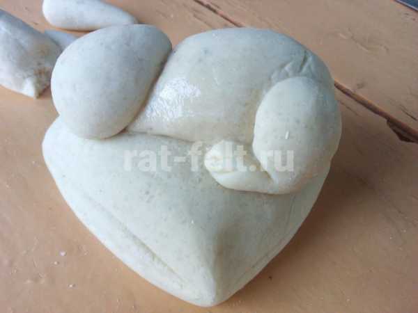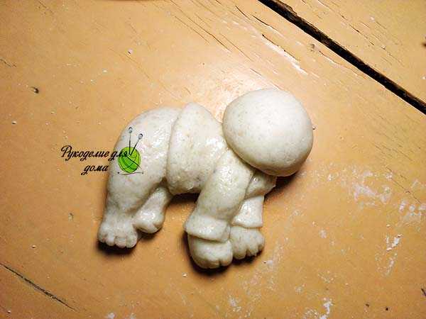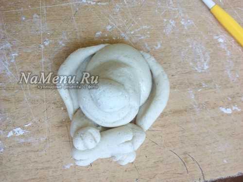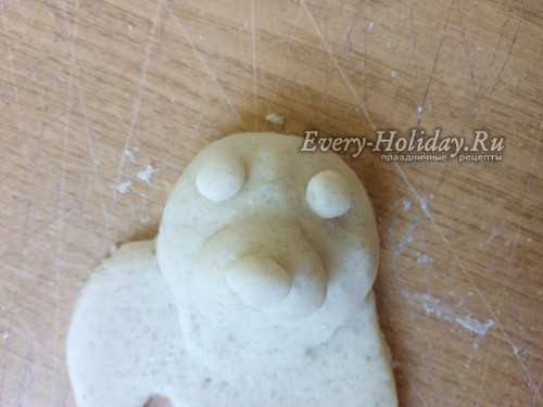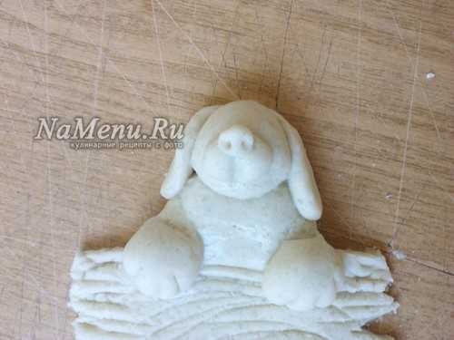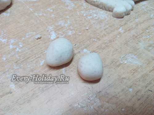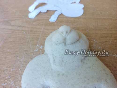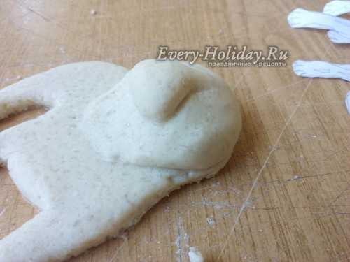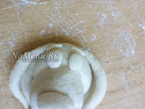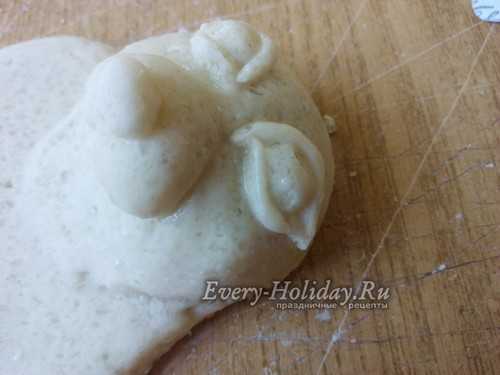 Теперь берем 2 одинаковых кусочка теста, скатываем шарики, затем вытягиваем их в форму заостренной капельки. Слегка расплющиваем и прилепляем ушки вверху на голову, загибая их вниз на морду.
