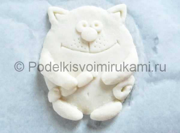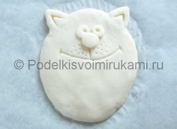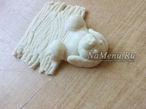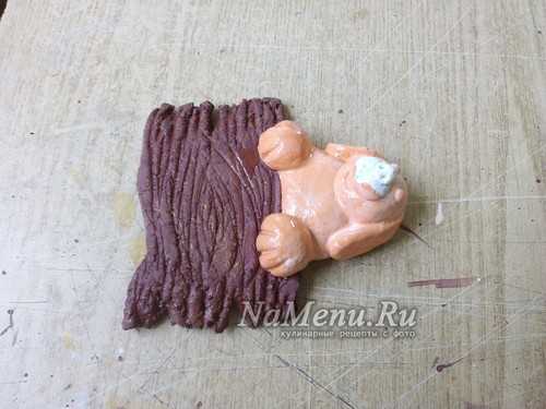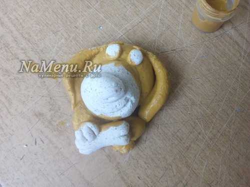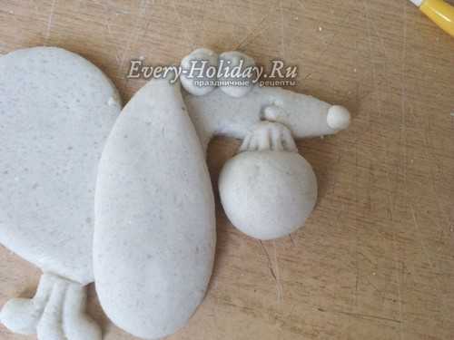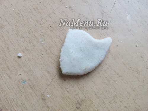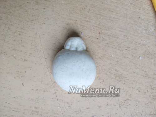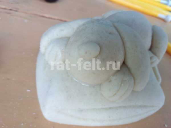 Из небольшого шарика, прилепленного в центре сделаем выступающую часть морды. Из маленького кусочка теста делаем треугольник и прилепляем сверху на голову, формируя ушко.