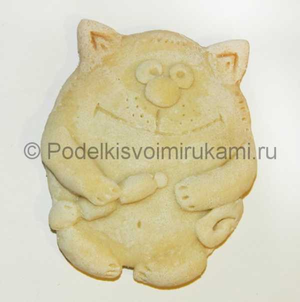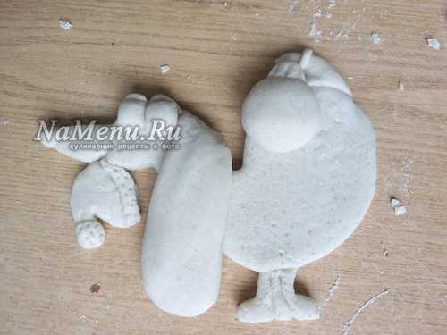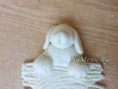 На бумаге, а лучше картоне рисуем шаблон. Можно прорисовать все детали, но при вырезании срезать все накладные детали и оставить только цельную часть. В данном случае уши и хвост делаем отдельно. Берем заранее заготовленное тесто и равномерно раскатываем его толщиной 1,5 – 2 см. Теперь на пласт прикладываем трафарет и обрезаем по контуру.