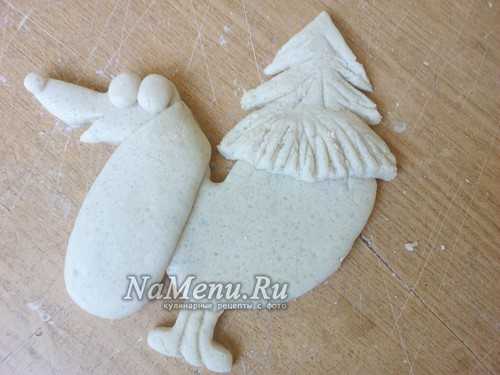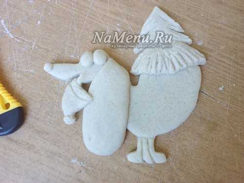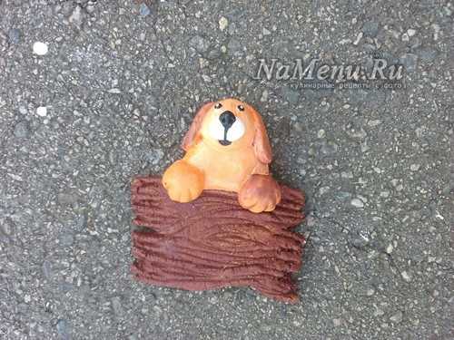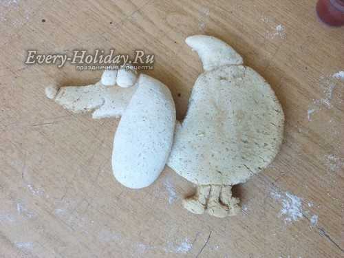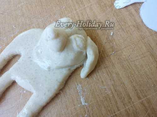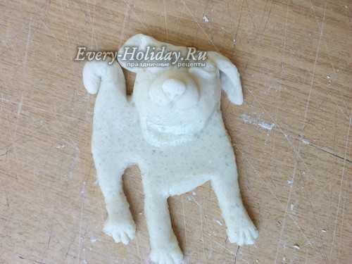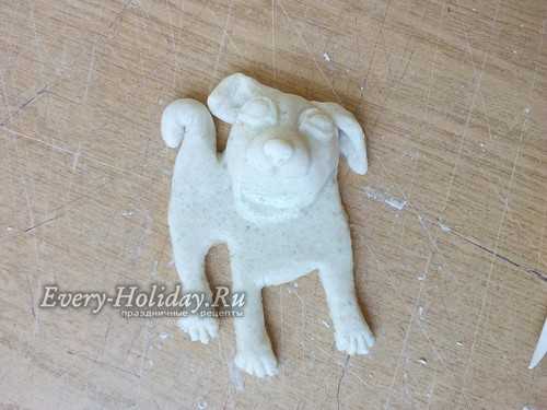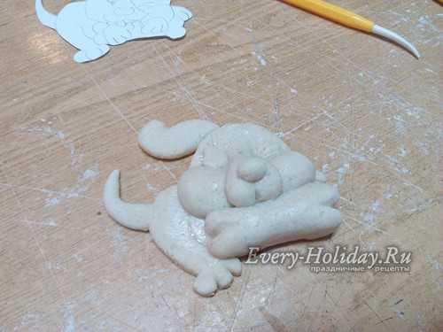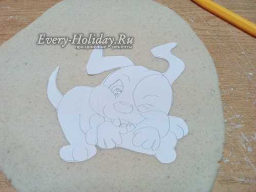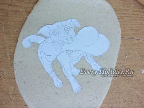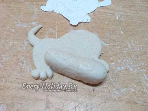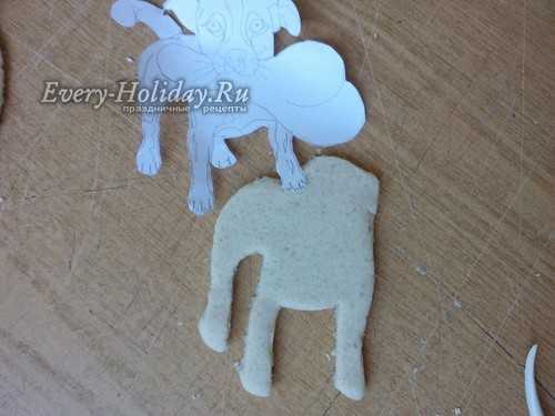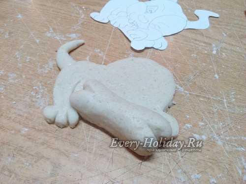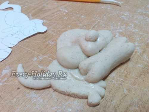 Тесто раскатываем в лепешку толщиной 1-1,5 см. Сверху прикладываем трафарет и вырезаем фигуру по контуру. Убираем все лишнее тесто и пальцами заглаживаем срезы туловища собаки.