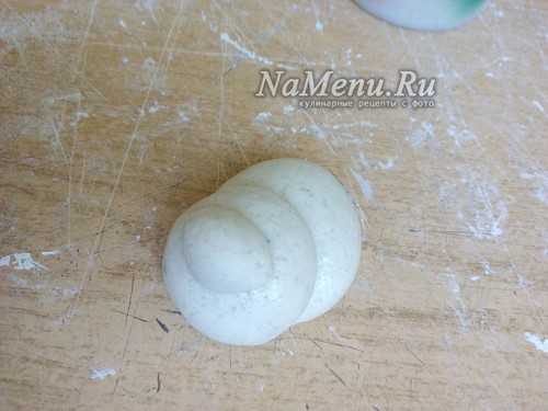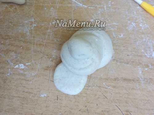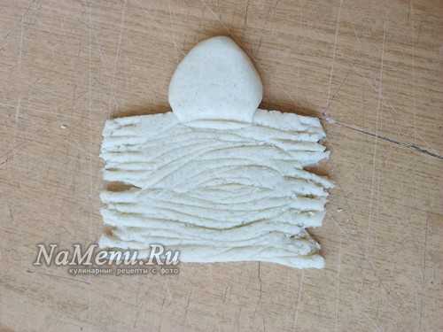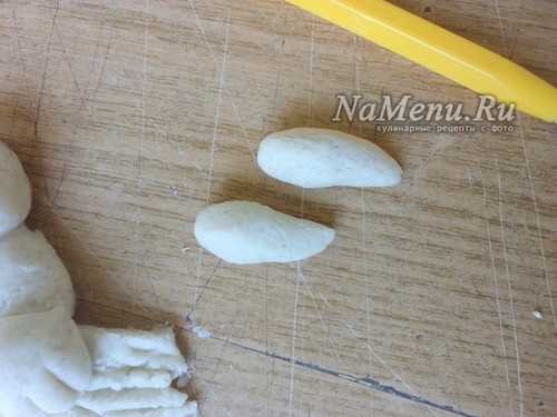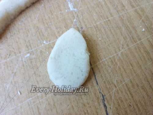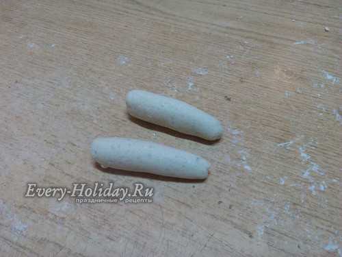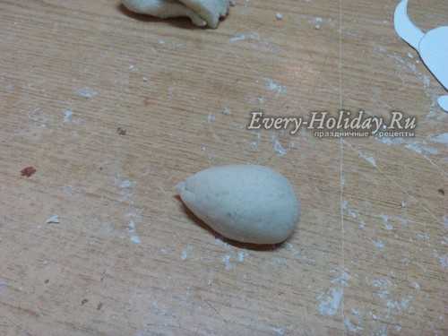 Из небольшого кусочка теста делаем подобие овала или точнее сказать формируем яйцо.