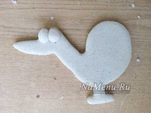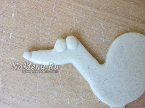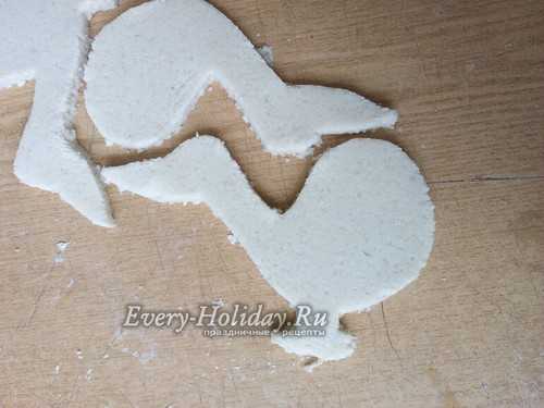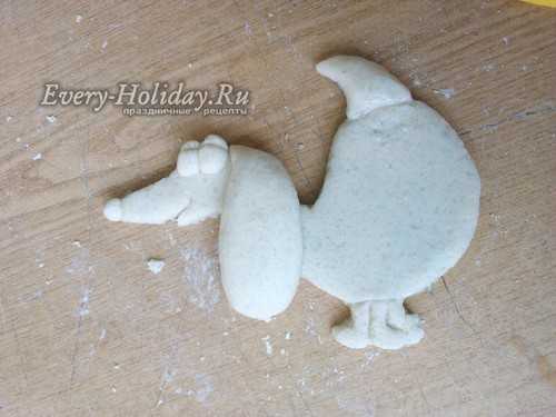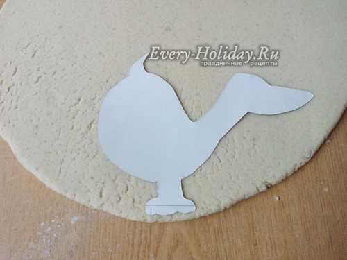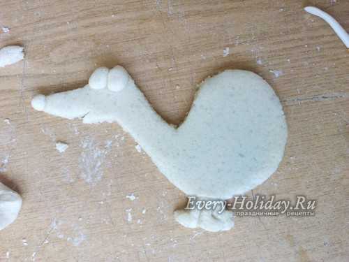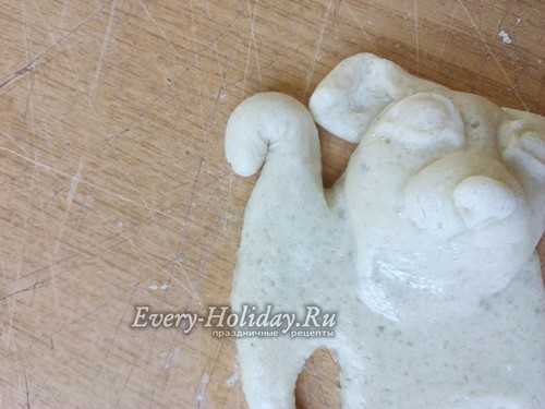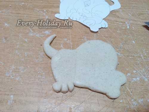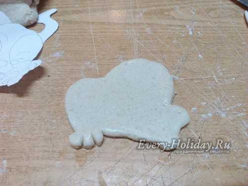 Тесто равномерно раскатайте в лепешку толщиной 1 см. На пласт приложите трафарет и вырежьте по контуру, без ушей и хвоста.