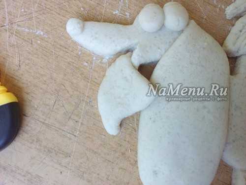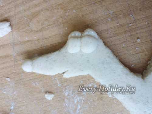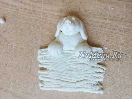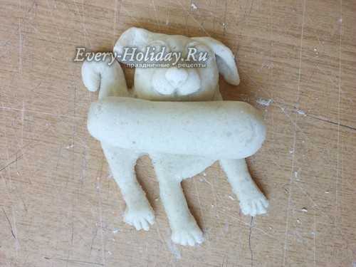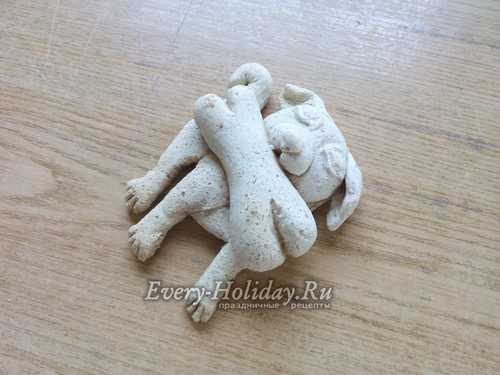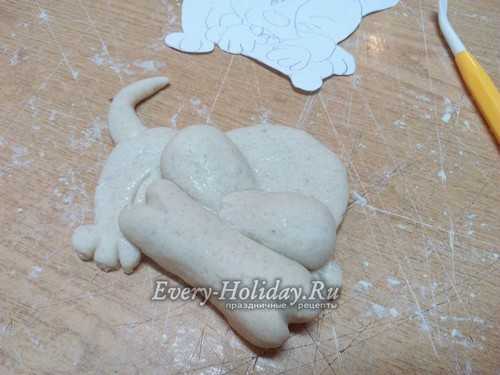 Нужно чтобы пес крепко держал свою кость, а значит, делаем лапки. Из 6 одинаковых кусочков формируем маленькие аккуратные колбаски. Выкладываем по 3 колбаски сверху на кость с двух сторон. Затем добавляем по небольшому кусочку теста по бокам от лапок до головы и хорошо разглаживаем тесто мокрой кисточкой.