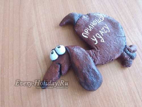 У вас уже подготовлены подарки для друзей к Новому году? Дополните их еще одной маленькой деталькой – вот таким милым сувениром. Собака из соленого теста своими руками делается не сложно. Процесс лепки сопровождается фото по шагам. А такой символ 2018 года может стать талисманом.Магнит «Собака» на холодильник своими руками