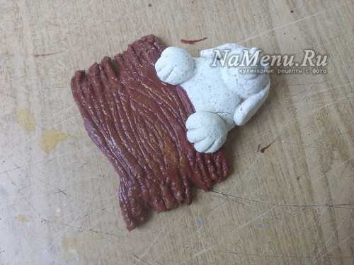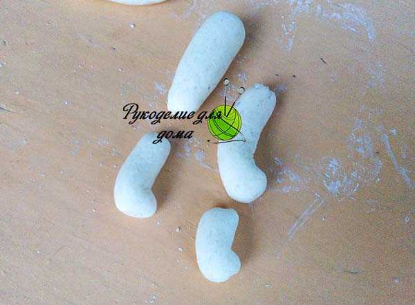 Теперь из колбасок одной толщины делаем 4 лапки разной длины. Один край колбаски немного загибаем, чтобы сформировать кисть лапы. Лапы, которые видны полностью будут длиннее, чем те, которые спрятаны за них.