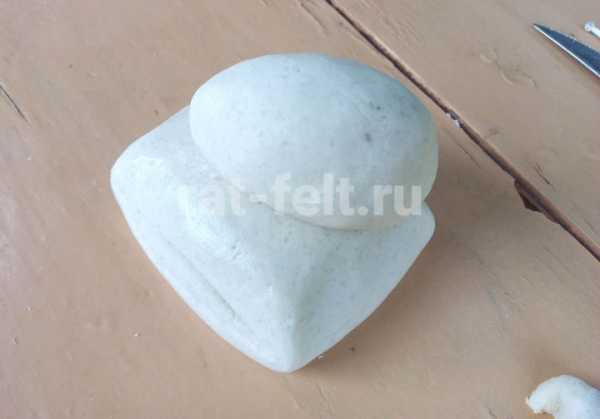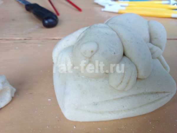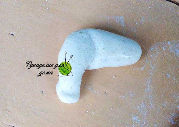 Теперь из припрятанного куска отрываем кусочек теста нужного размера. Формируем туловище собаки. Тело похоже на вытянутое яйцо. Укладываем тельце на подушку.