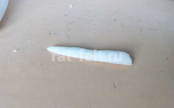 Чтобы сделать хвостик нужно также раскатать колбаску из небольшого куска теста. С одной стороны колбаску сильно заузим, с другой оставляем немного шире. Хвостик прилепите к низу спины, положите и заверните его по подушке.
