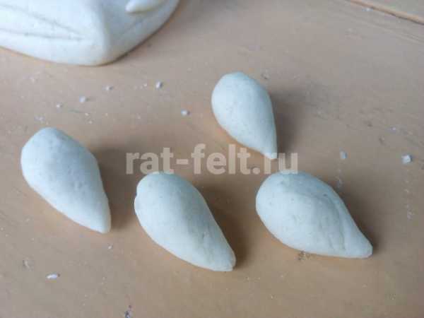 Берем такие же 2 кусочка теста как для передних лапок и тоже скатываем из них капельки, но более вытянутые.