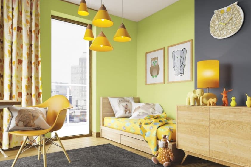 Детская комната. Здесь сочетание желтого и зеленого смотрится лучше всего. Этот дуэт ассоциируется с природой, свежей зеленой травой, щедро облитой весенним солнцем, бодростью, излучает тепло, дарит хорошее настроение.