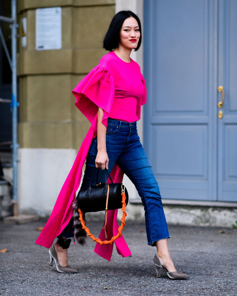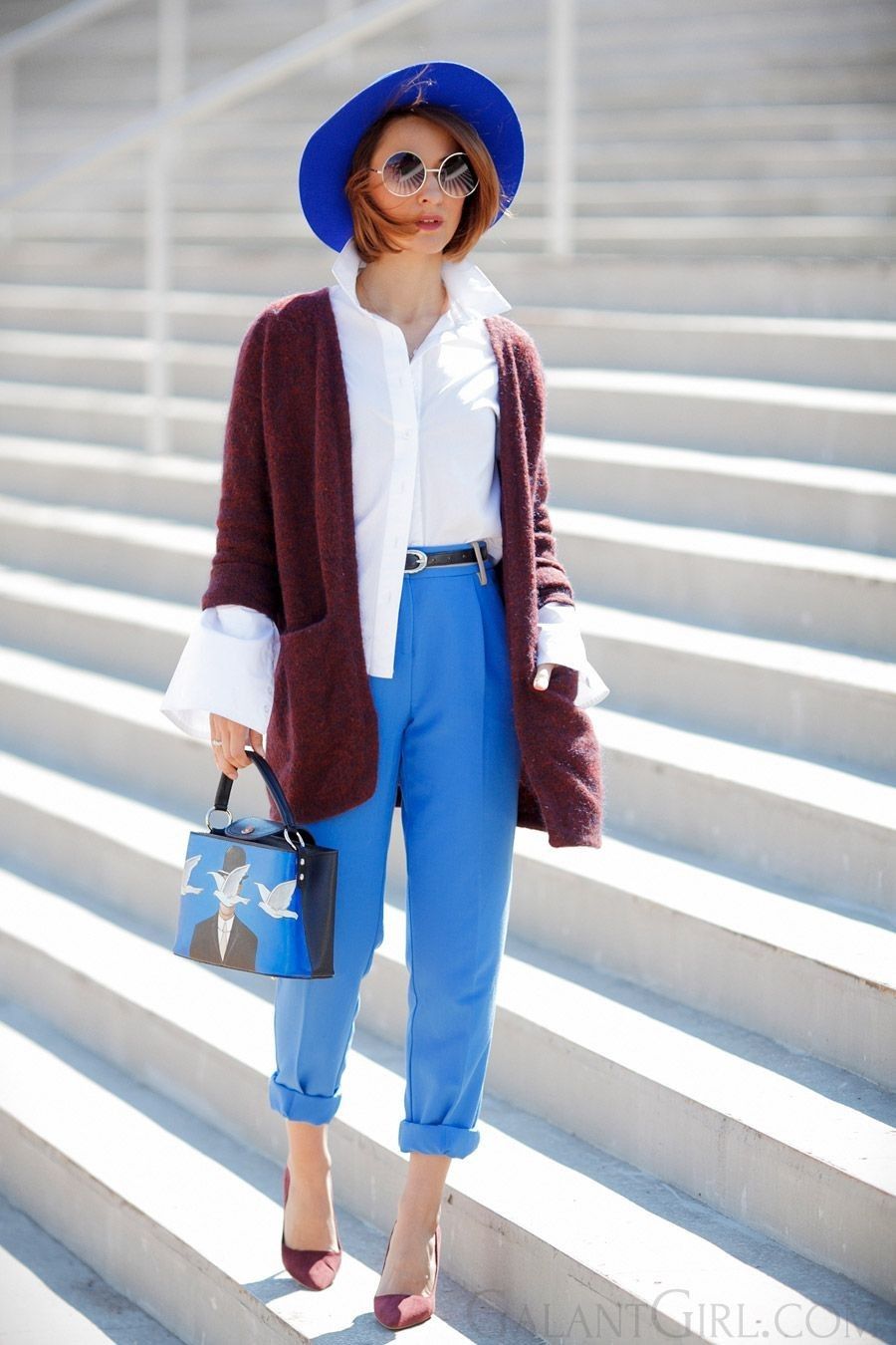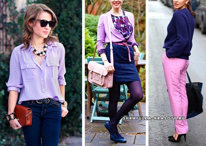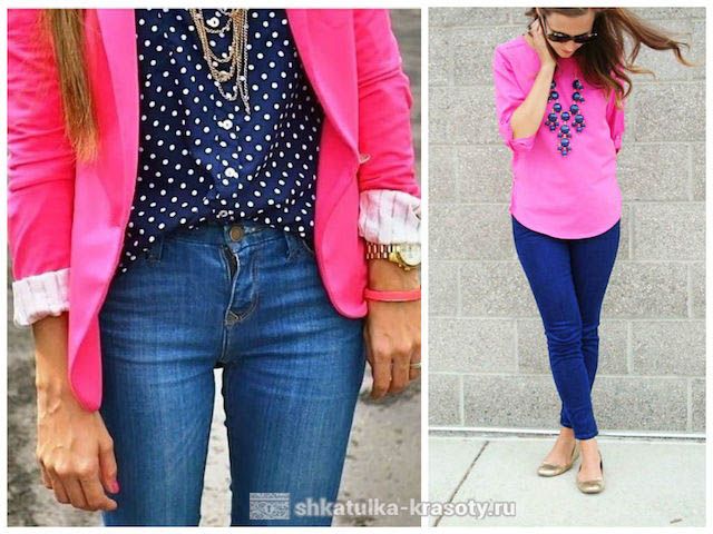 Идеальный вариант, когда низ – это черные брюки или джинсы, сумочка – небольшая и тоже черная, а жакет нежно-розового цвета или цвета фуксии. В первом случае мы получим стильный, сдержанный, элегантный образ, а во втором – более броский, кокетливый и несерьезный.
