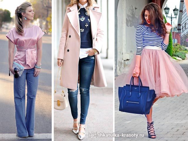 Кстати, сочетание белого и бледно-розового (плюс еще какой-то оттенок в наряде) может подойти даже для деловой встречи или работы, если дресс-код не совсем строгий. Вот несколько фото примеров сочетания розового и белого цветов: