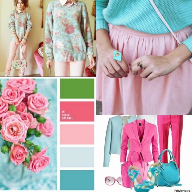 В то же время, если ярко-розовый дополнить нежно-голубым, мятным оттенками, то сочетание получится очень интересное и эффектное.