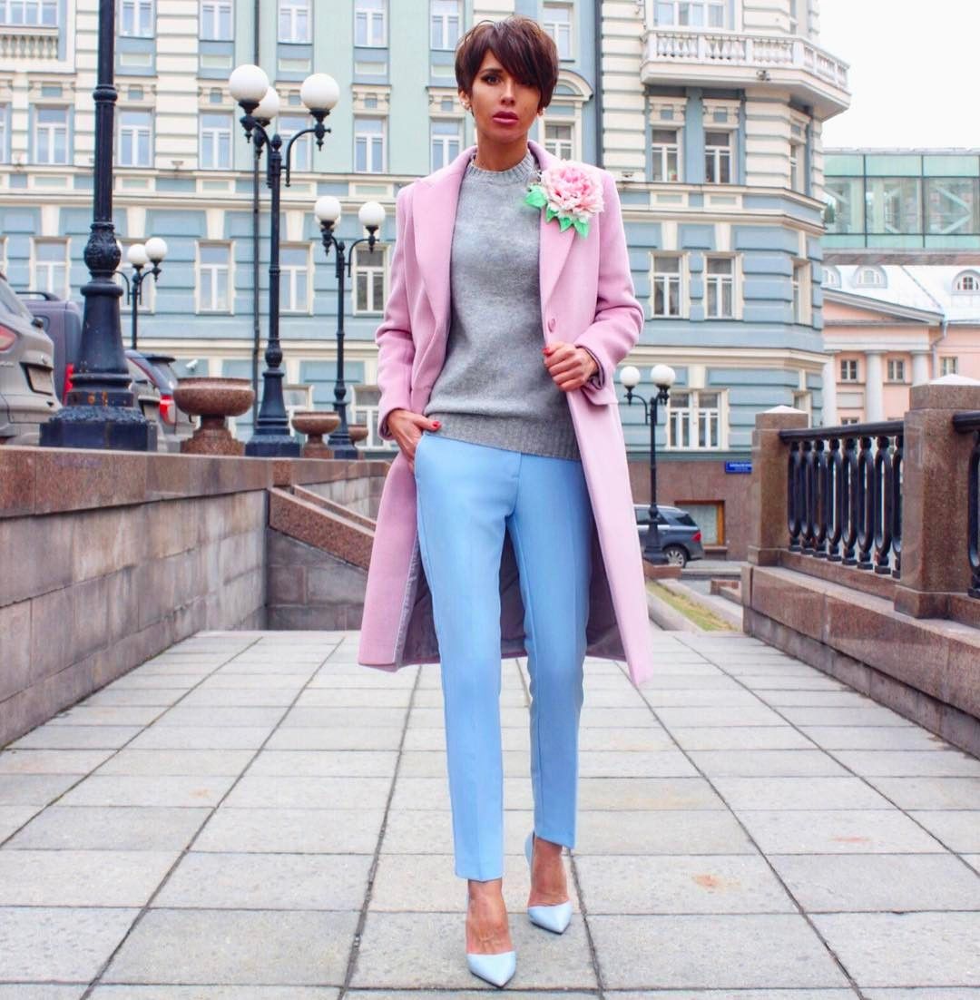Вот цвет номер один для создания средней яркости образов с участием розового цвета. С нежно-розовым сочетайте светло-серый как в виде аксессуаров, так и других предметов одежды.