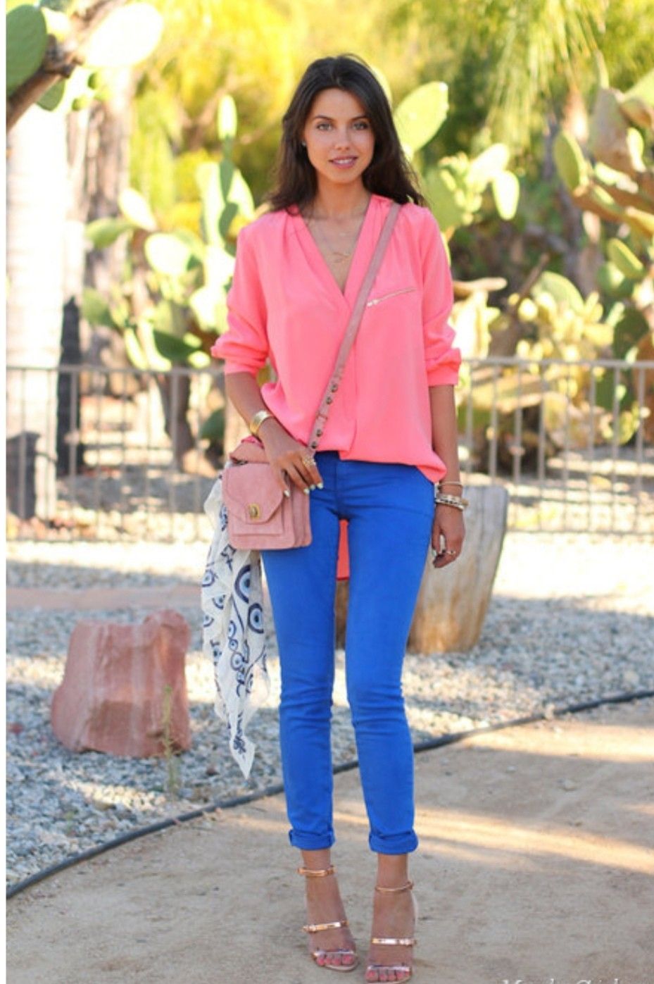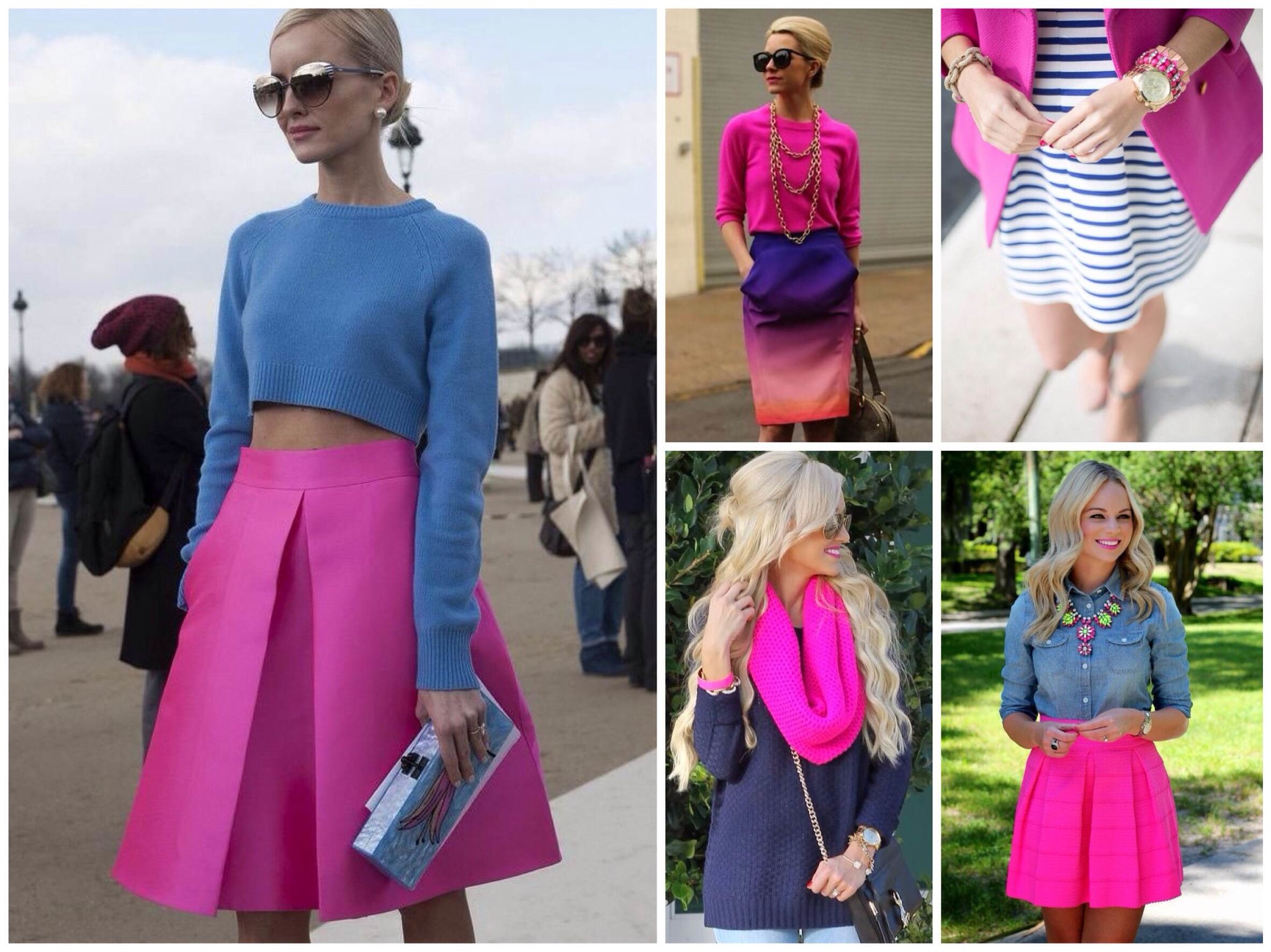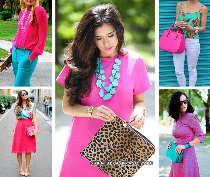 Сочетание же ярких тонов розового с не менее яркими вышеуказанными цветами будет смотреться крайне эффектно и заманчиво, так что такие образ не следует перегружать аксессуарами, добавить к такому ансамблю можно только еще один оттенок и нужно учесть, что это сочетание не для работы, учебы и не на каждый день.