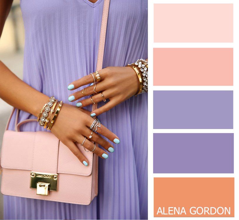 А мягкие теплые розовые создают более нежные сочетания. Чем спокойнее оранжевый, тем спокойнее сочетания.
