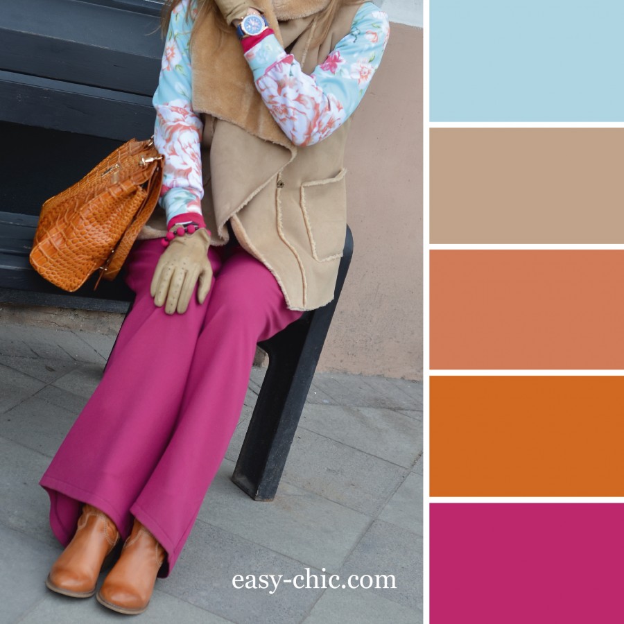 А если говорить о сочетании фуксии с пастельными тонами, то, например, с желтым, персиковым, салатовым удачный образ не получится.