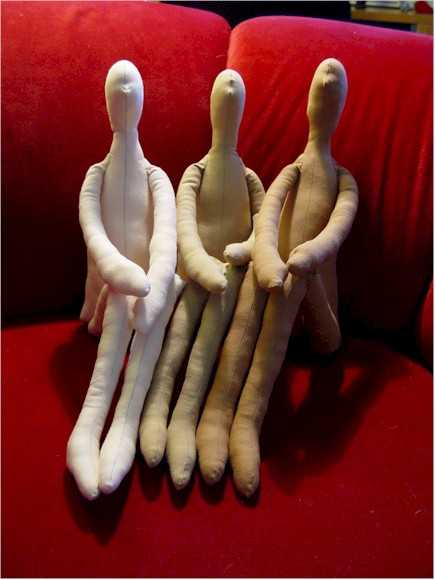 Набивают эти игрушки в основном холлофайбером или синтепоном (можно воспользоваться наполнителем из старой подушки). Отдельные детали кукол можно набить ненужными обрезками ткани, остающимися после шитья.
