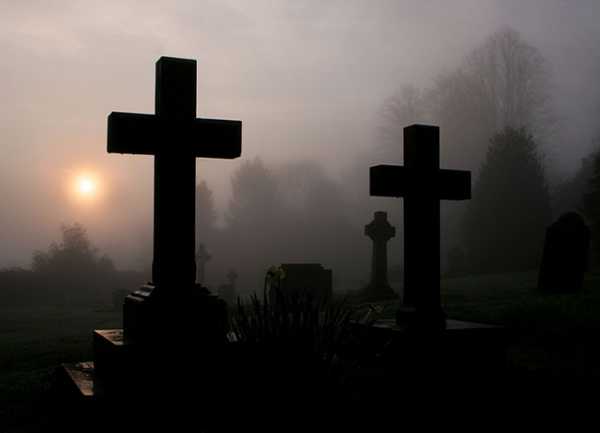 Рассвет на местном кладбище в Данехилле, Сассекс. Туман ранним утром украсил общий фон картины.