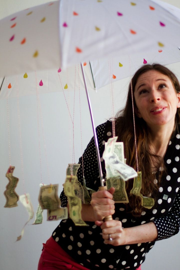 Купите красивый зонтик.Прикрепите к нему нитки, а на них повесьте деньги. Придумайте оригинальную подачу денег.