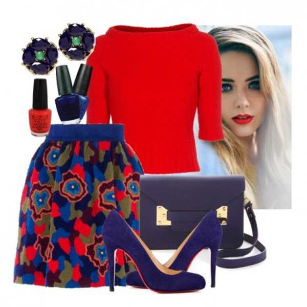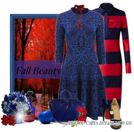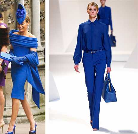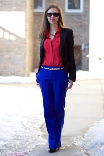 Сапфировый более уместен для посещения театра или ресторана, темный чернильный — для вечернего наряда. Выбирая сочетание красного цвета и насыщенного синего (надо сказать, очень смелое), следует помнить, что один цвет должен стать дополнением для другого (правильным дополнением к синему наряду могут стать сумочка красного цвета, украшения или обувь). Такое сочетание придаст уверенности, образ будет элегантным и стильным.