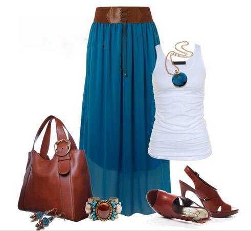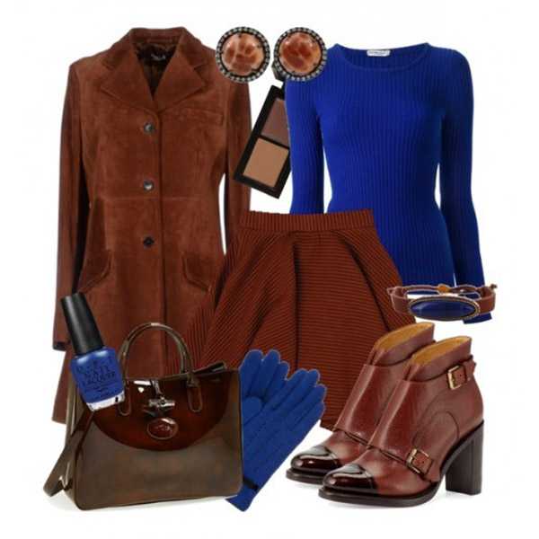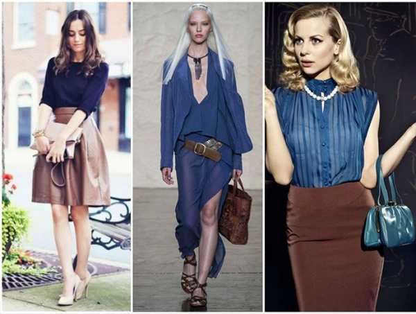 Коричневые ботиночки идеально подойдут синим брюкам. А мягкая плюшевая коричневая юбка отлично будет смотреться с синей легкой блузой. Причем, коричневый не обязательно должен быть темным – возможно использовать даже бежевый оттенок, но чем светлее, тем аккуратнее и избирательнее надо быть.