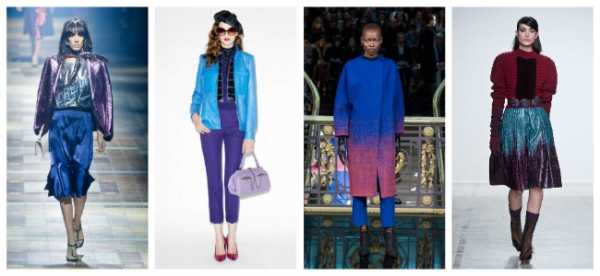 - Комбинация фиолетового с синими тонами делает гардероб спокойным, гармоничным. Для создания стильного лука стилисты рекомендуют сочетать синий глубокого оттенка и темно-фиолетовый;