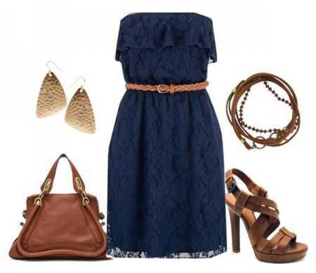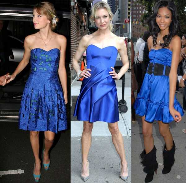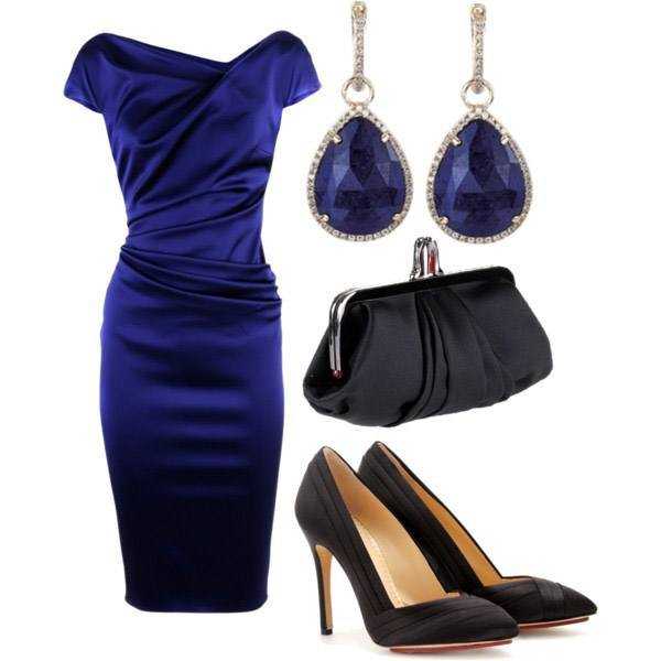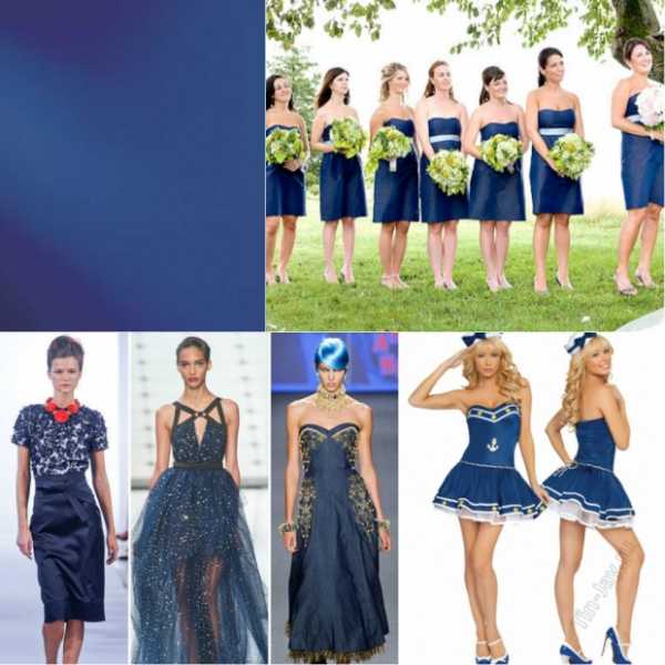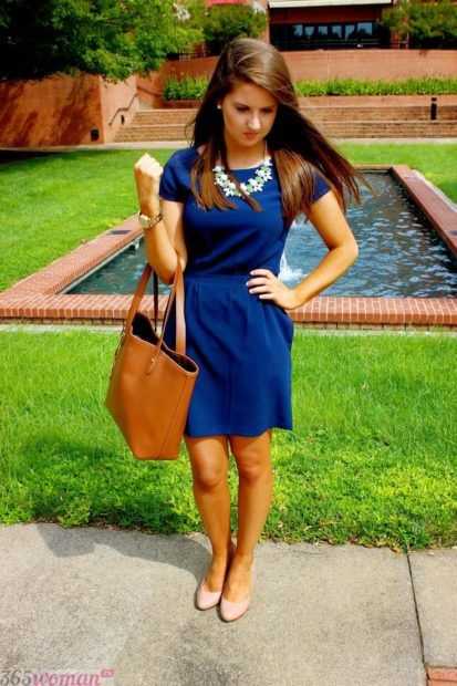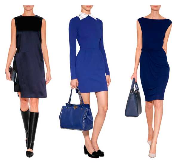 Идеальны платья в темно-синих тонах — они подходят всем. Платье цвета индиго придает стройность и удачно скрывает недостатки. К такому платью следует выбрать светлые коричневые или бежевые туфли и сумочку в тон обуви.