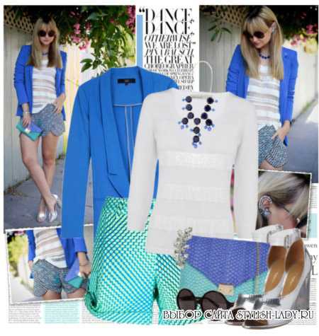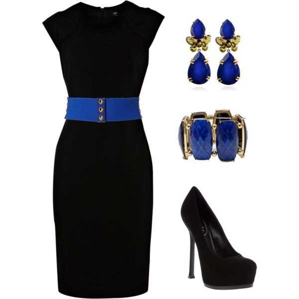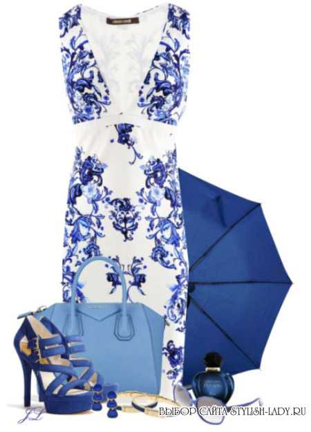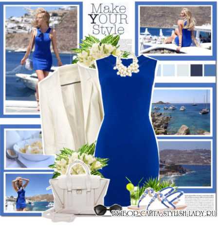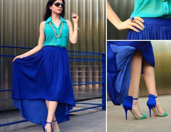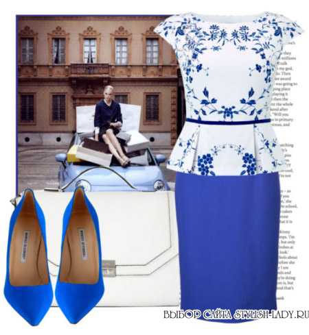 Выбирая такой вариант, вы можете легко ошибиться с количеством черного или выбрать слишком темный синий. Запомните важное правило – синий должен доминировать и при этом быть достаточно ярким, никаких темно-синих оттенков, а вот черного используем как можно меньше – поясок или черная блузка, не больше.
