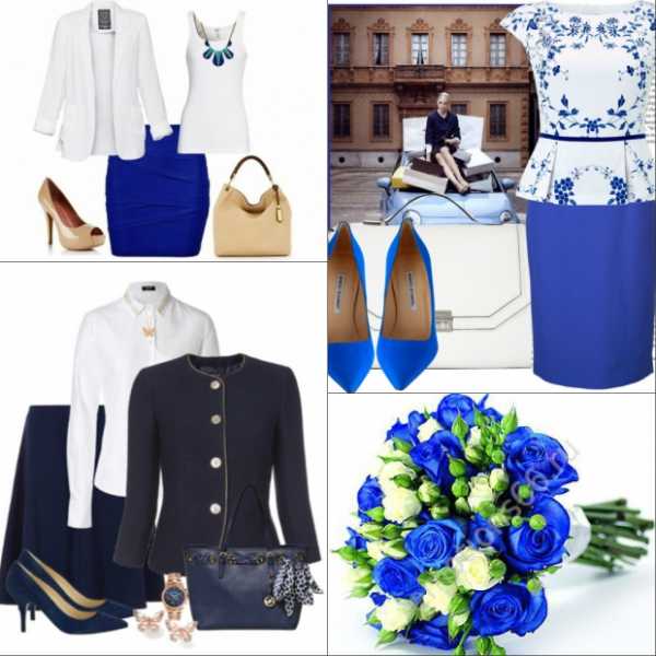 Очень эффектно смотрится сочетание синего цвета с белым. Готовый образ получается морским, свежим и легким. При этом использовать такое сочетание вполне уместно как для рабочего костюма, так и для одежды, предназначенной для любых других ситуаций. Например, к деловому костюму глубокого синего цвета отлично подойдет белая рубашка, шейный платок, ремень или сумка. А вот белое вечернее платье можно сделать еще более привлекательным при помощи синего пиджака, массивного колье или любых других аксессуаров цвета морских волн.