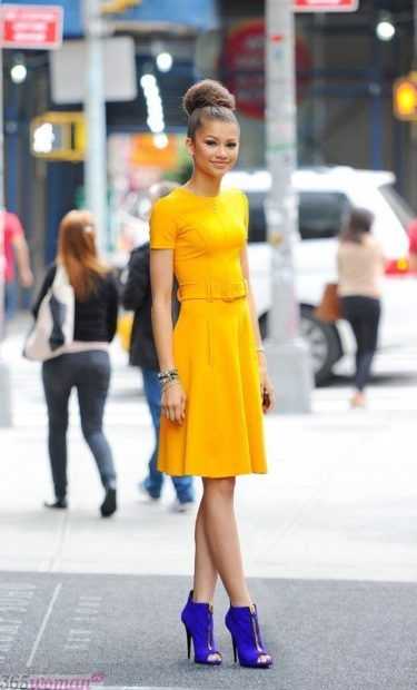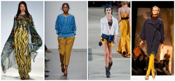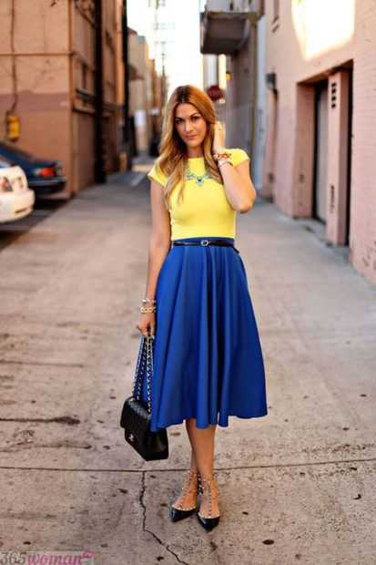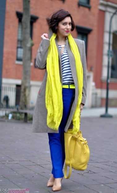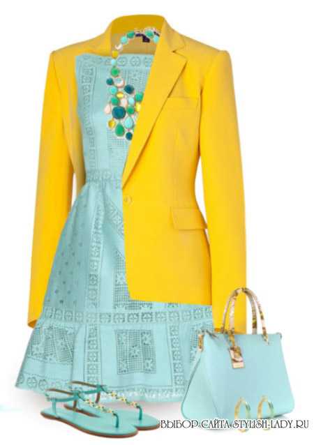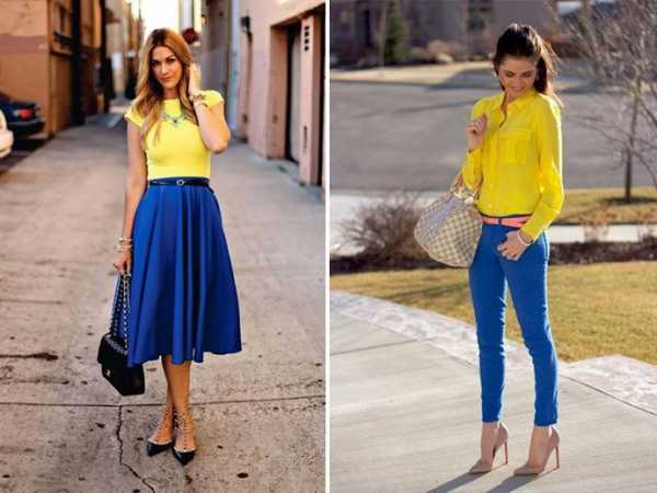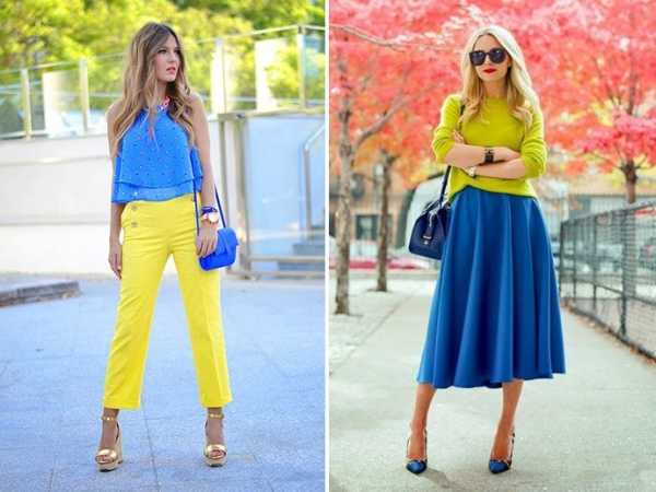 Но и здесь надо быть осторожным и следовать некоторым советам – сочетать следует только оттенки одинаковой интенсивности – ярко-синий и такой же яркий желтый и наоборот, небесный цвет с бледно-желтым. В первом случае вы будете выглядеть дерзко, модно, стильно, а вот второй образ получится очень романтичным.