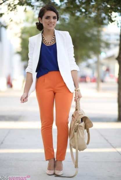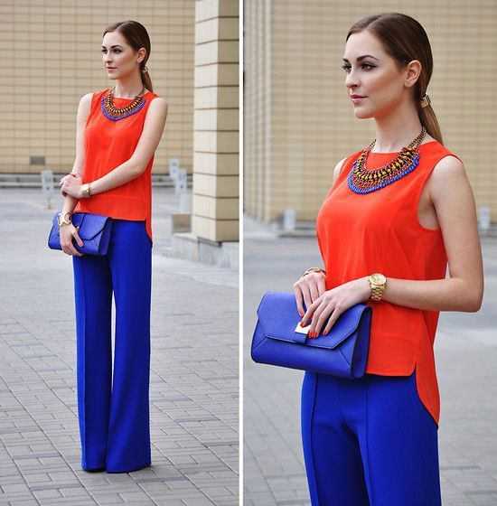 Вообще — это летнее сочетание, оно вызывает воспоминания об отпуске на море, но никто не запретит вам поздней осенью надеть пальто апельсинового цвета, а к нему яркие синие сапоги. Представьте только, как сильно вы будете выделяться из толпы однообразных серых и черных курток.