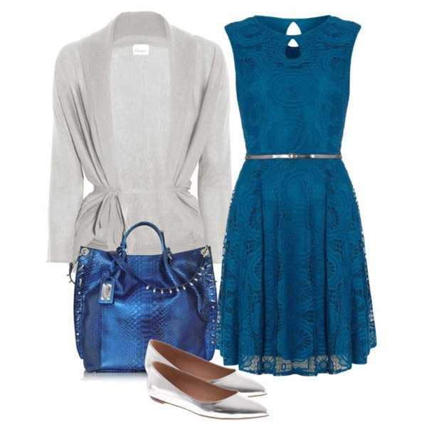 - Серебристый цвет изысканно подходит к синему и делает образ роскошным, торжественным. Для гармоничного вида рекомендуется выбирать серебристые аксессуары: сумочка, легкий шарф, шейный платок, украшения. Серебристые туфли на шпильках сделают вечерний наряд сказочным, оригинальным.