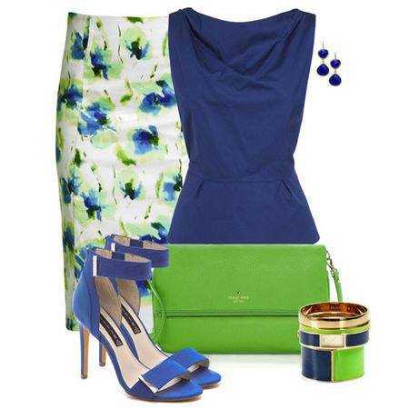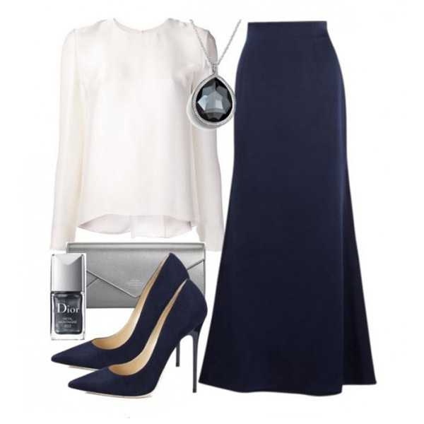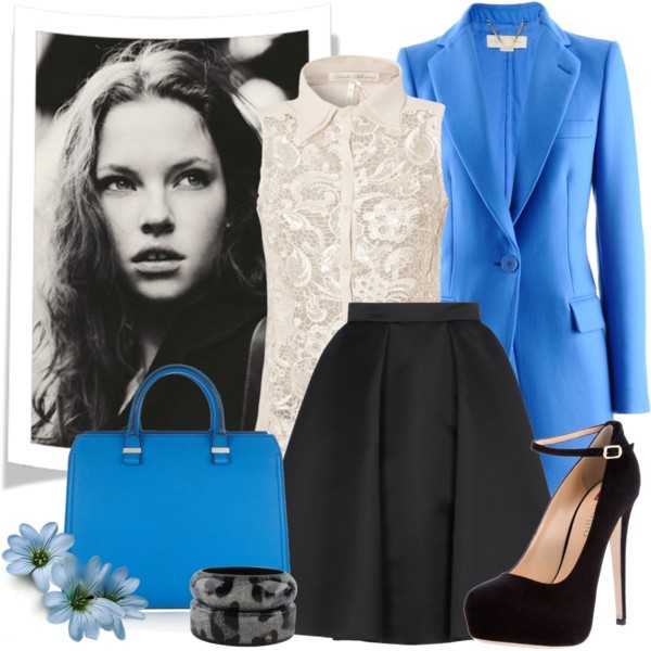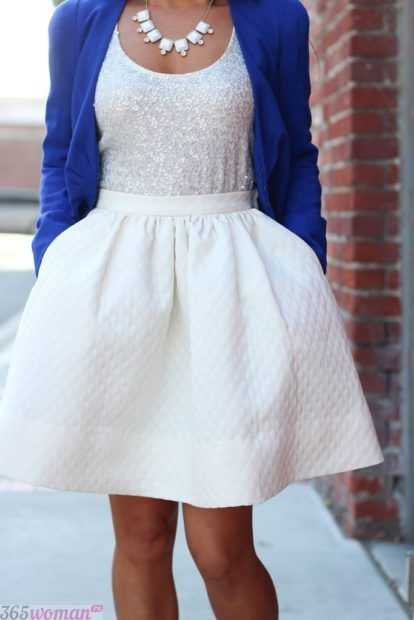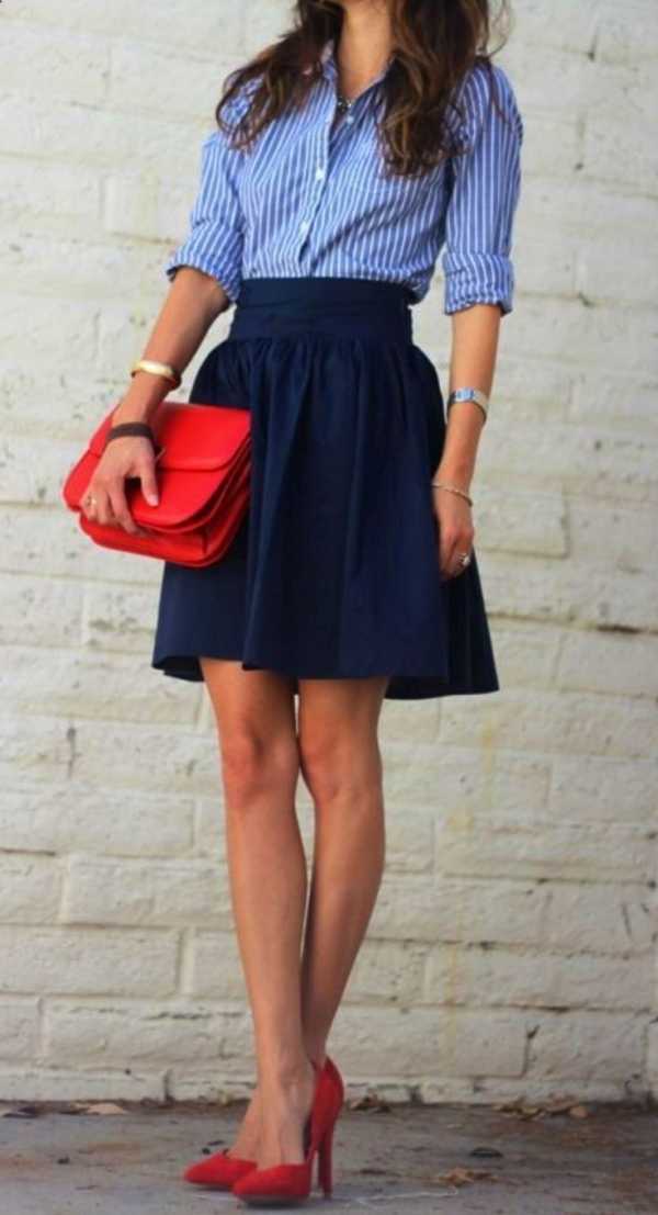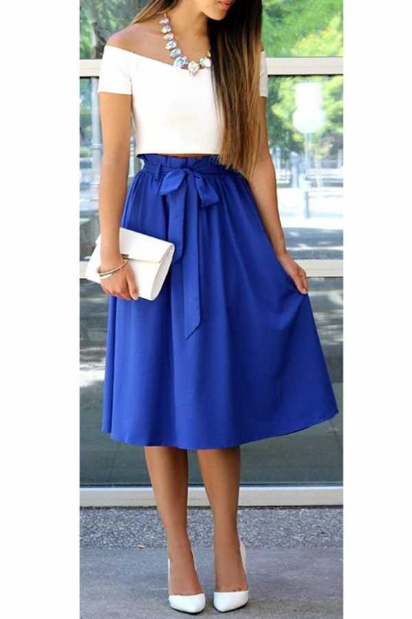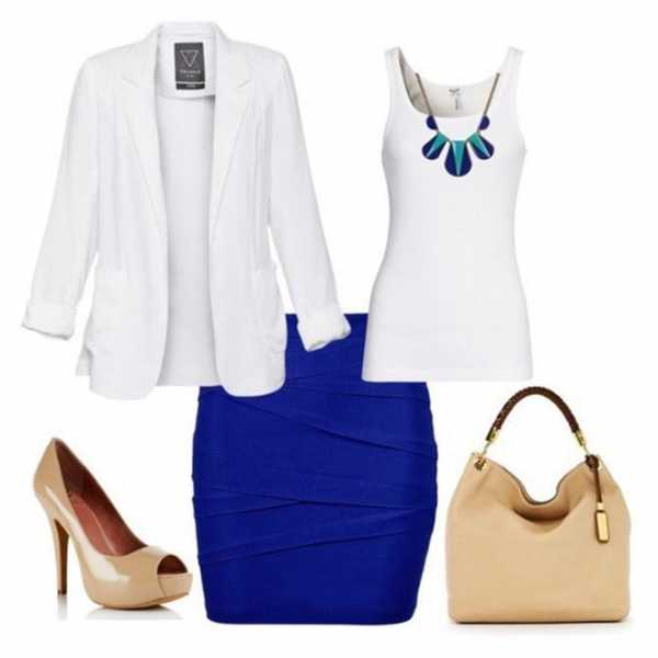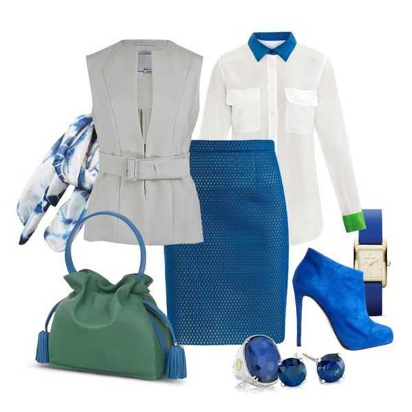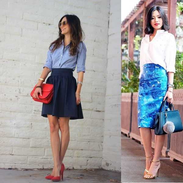 Для офиса можно выбрать синюю юбку и молочную блузку, а если добавить еще и синий пиджак, то получится просто беспроигрышный вариант. Гораздо смелее и интереснее выглядит белая юбка и синяя блузка.