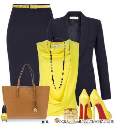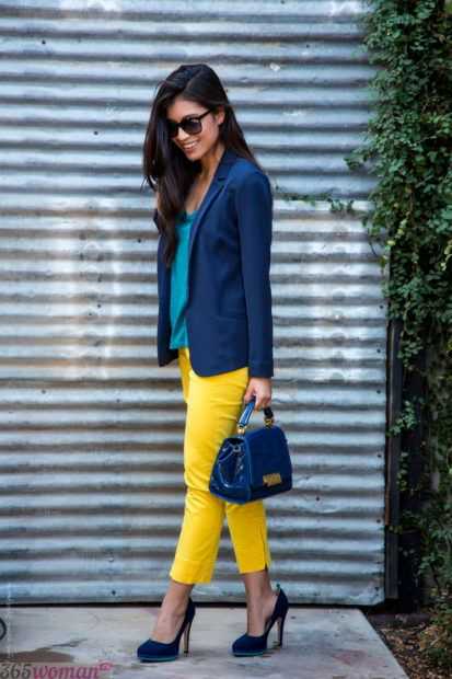 И опять же, есть варианты как для офиса, так и для вечерней встречи с друзьями. На работу можно пойти в синей юбке и легкой желтой блузке, начальник точно не будет против. А к друзьям можете надеть желтый пиджак под синие брюки – весело, задорно, необычно.