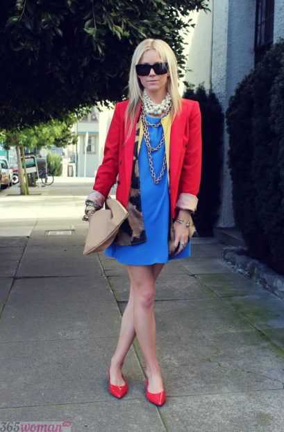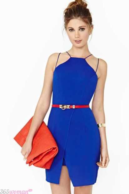 Например, можно разбавить синий цвет красными аксессуарами. Но в данном случае также очень важно не переборщить с их количеством. Тонкий ремешок, серьги, кулон на шею, браслет или красный миниатюрный клатч – все это станет отличным дополнением к костюму или платью синего цвета.