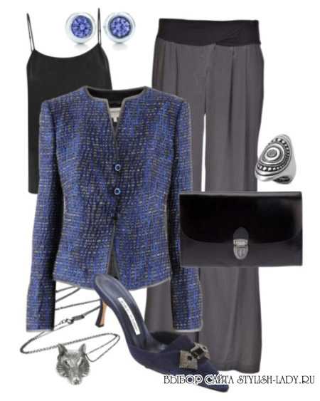 Синий цвет в сочетании с лиловым как нельзя лучше подойдет для вечернего наряда.. Достаточно интересны оттенки синего и серого оттенков. Комплект, выполненный в серо-синем цвете, вполне уместен для похода в ресторан или театр. Сочетание синего цвета и белого принято считать классическим и очень гармоничным.