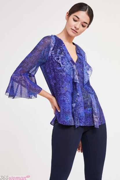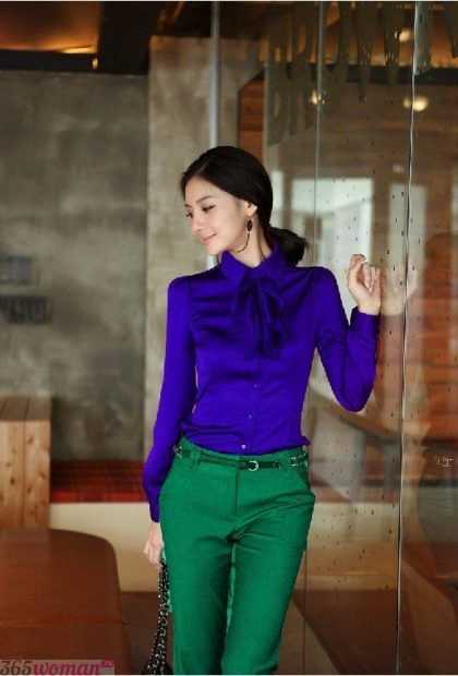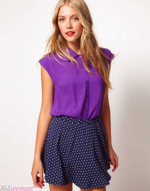 Если же вы хотите одеться в такие цвета в офис – наденьте темно-синюю юбку и такую же темно-фиолетовую блузку. Это смелое решение, но, если вы угадаете с оттенками, выглядеть вы будете очень эффектно. Если не боитесь рисковать – пробуйте и вы не останетесь незамеченной.