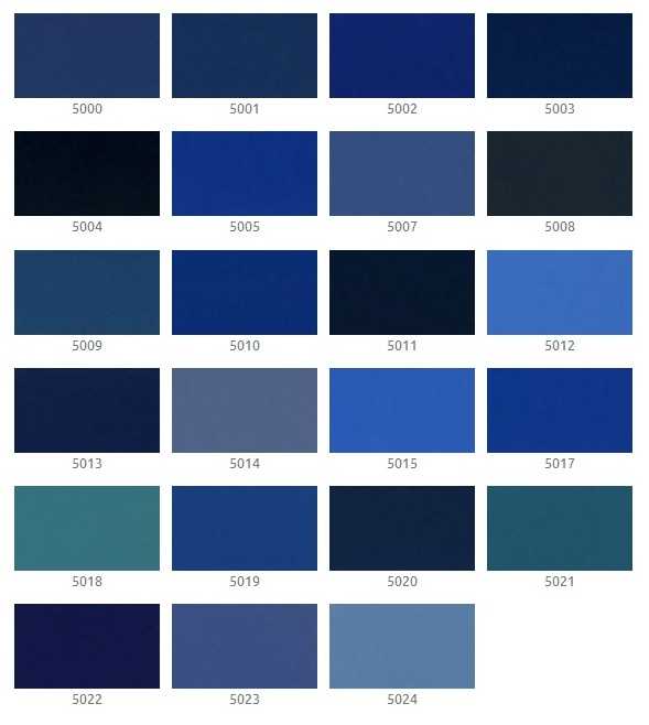 Самым популярным в мире считается цветовой стандарт RAL, разработанный еще в начале ХХ века. Оттенки обозначаются цифрами, и палитра тонов постоянно пополняется. Сейчас стандарт насчитывает 213 цветов, сгруппированных в 6 диапазонов. Синие тона числятся под номерами RAL 5000 — RAL 5026 и имеют следующие названия: