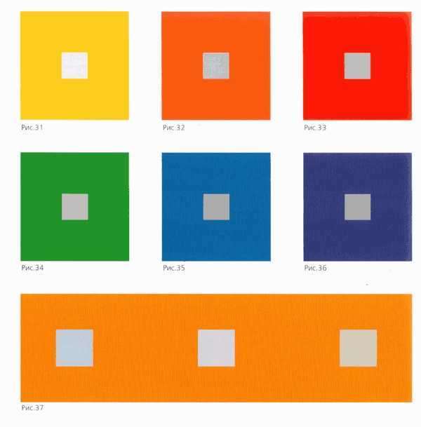Каждый цвет в глазах зрителя одновременно порождает и свои противоположный тон. Рисунки 31-36 демонстрируют этот опыт несколько иным способом. В каждый их шести квадратов, окрашенных в чистые цвета, помещено по маленькому квадрату нейтрального серого цвета, светлота которого соответствует светлоте основных цветов.