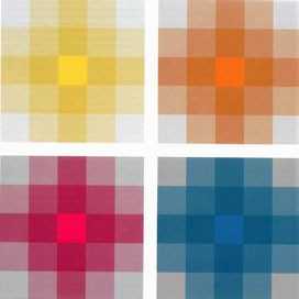 Чистый цвет помещается в центре, а нейтральный серый одинаковой яркости в каждом из четырёх углов. Затем смешиваем серый цвет с чистым, постепенно получая четыре более или менее разбавленных промежуточных тона. Для выявления контраста насыщения, необходимо устранить контраст светлого и тёмного, с тем чтобы яркость всех квадратов была одинаковой.