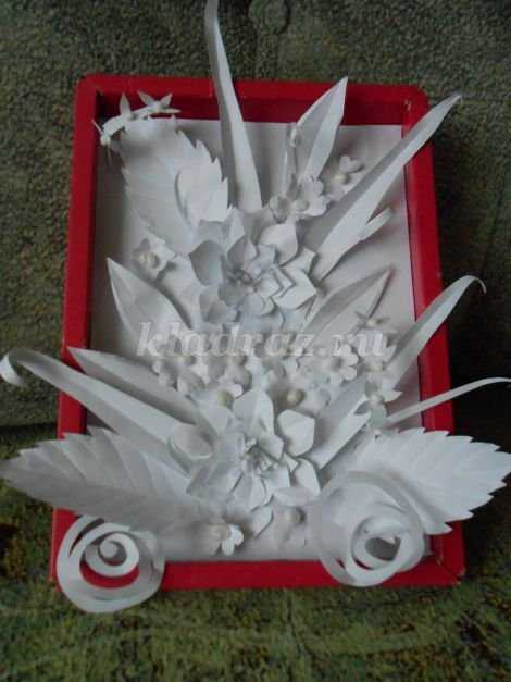 10. Творчески фантазируя, создаем композицию: цветы, объемные листья, завитки красиво размещаем и приклеиваем.