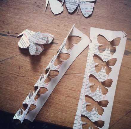 Непривычно смотрятся бабочки, вырезанные из страниц глянцевых журналов и газет.